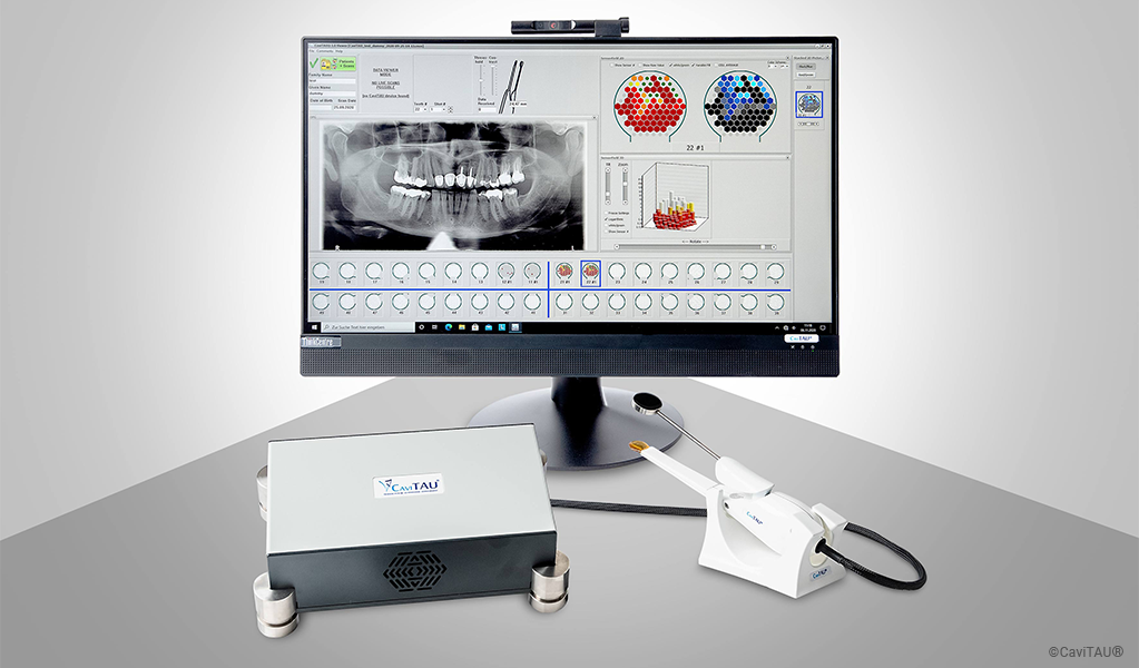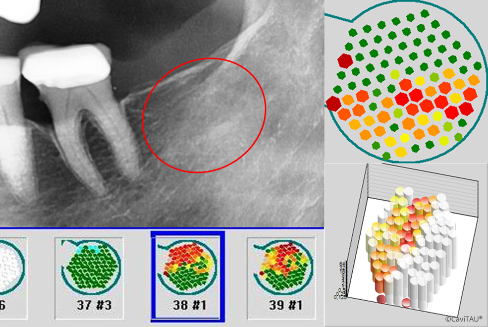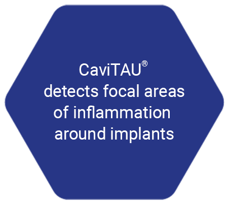 Trans-alveolar ultrasound sonography, which is also used in the CaviTAU®, gives you an objective intraosseous insight into the interaction between the immune system and the bone system around the dental implant in question. This enables you to detect partially failed osseointegration and reduced hard tissue formation in clinical and numerical detail. This allows you to specifically visualise peri-implant bone diseases in dental implantology and take them into account in the next step.