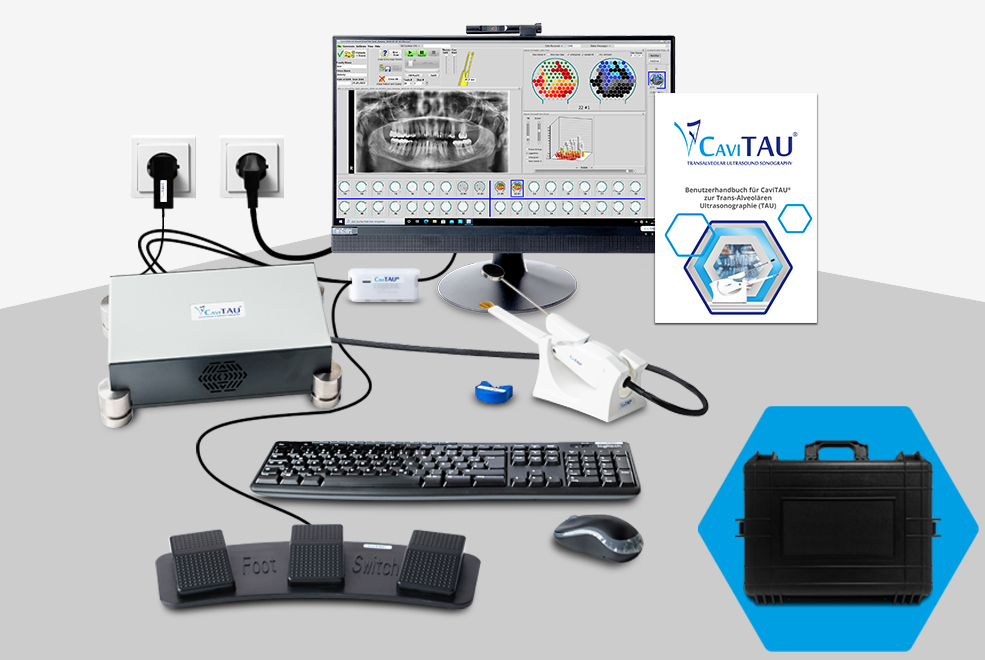 CaviTAU® erzeugt einen Ultraschallpuls und leitet den Puls durch den Kieferknochen. Der Impuls wird anschließend von einer Ultraschallempfangseinheit erfasst und ermittelt. Abschwächungen der Amplitude des Pulses zeigen pathologische Veränderungen im Kieferknochen an. Die Ergebnisse werden auf einem Farbmonitor angezeigt und zeigen je nach Dämpfungsgrad unterschiedliche Farben.