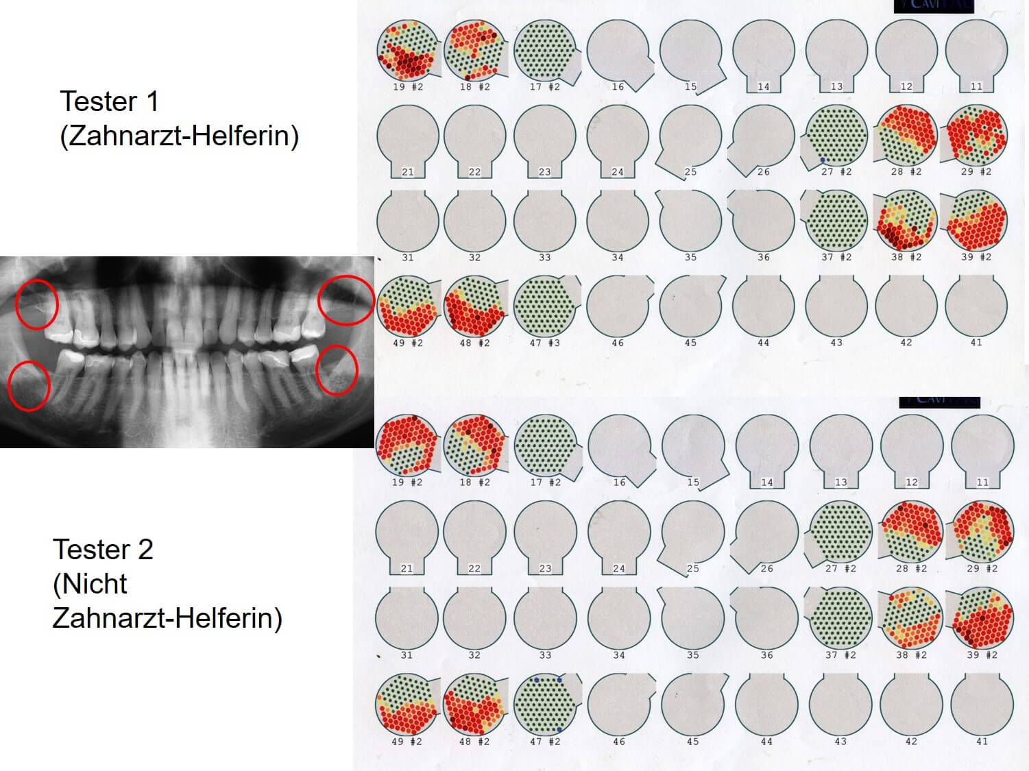 CaviTAU® Ergebnisse sind von der messenden Person unabhängig und reproduzierbar. Das Beispiel zeigt zwei CaviTAU® Mess-Ergebnisse, erstellt von zwei verschiedenen Testerinnen, völlig unabhängig voneinander. Geringe Abweichungen sind vorhanden durch unterschiedliche Stellung des Handstücks innerhalb des Mundes. Die interpretatorischen Konsequenzen aus beiden CaviTAU® Bildern sind gleich.